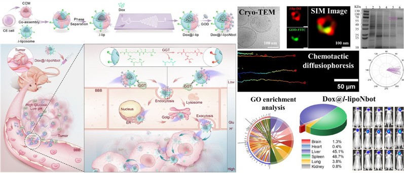 Чтобы преодолеть эту проблему, команда исследователей обратилась к уникальным биохимическим характеристикам микроокружения опухоли — таким как градиетн протонов и сверхэкспрессия γ-глутамилтрансферазы. Новаторски используя многоуровневую стратегию молекулярной сборки, они массово разработали самонаводящийся липосомальный наноробот янусовой структуры. С одной стороны, наноробот оснащён ферментным модулем, катализирующим распад эндогенной глюкозы, что обеспечивает его автономное движение и направленное перемещение к центру опухоли по протонному градиенту. С другой стороны, наноробот подвергнут γ-глутамилированию, что позволяет ему избирательно связываться с γ-глутамилтрансферазой, высокой экспрессией которой характеризуются клетки гематоэнцефалического барьера и опухоли. В этом процессе непосредственно на месте формируются положительно заряженные первичные амины, что запускает адсорбционно-опосредованный трансэндоцитоз и, благодаря «эффекту протонной губки», обеспечивает эффективный выход из лизосом. В результате наноробот успешно преодолевает гематоэнцефалический барьер и множественные барьеры микроокружения опухоли. Эксперименты на животных показали, что применение такого липосомального наноробота повышает эффективность доставки лекарств более чем в четыре раза, существенно продлевает медиану выживаемости и демонстрирует хорошую биосовместимость и низкую токсичность.
