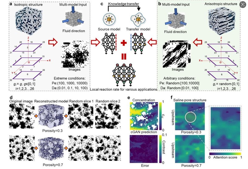 Для решения этой задачи команда профессора Ю Шицзе предложила инновационный метод глубокого обучения компьютерному зрению (DLCV), объединяющий условную генеративно-состязательную сеть (cGAN) и переносное обучение представлений признаков (FRT). С помощью трёхмерной реконструкции сеть восстанавливает внутреннюю трёхмерную структуру катализатора на основе двумерных изображений, а затем, учитывая реакционные условия, прогнозирует распределение локальных скоростей реакции, реализуя переход от 2D-изображений к 3D-информации о локальных реакционных процессах. Модель DLCV с помощью механизма внимания выявила, что сужения пор, изогнутые каналы, фрактальные структуры и их комбинации являются ключевыми зонами, определяющими транспортные свойства. В сочетании с теорией взаимодействующих физических полей этот подход позволил раскрыть внутренние механизмы взаимосвязи массообмена и реакционной кинетики, сделав возможной визуализацию динамики каталитических реакций. Исследование демонстрирует огромный потенциал искусственного интеллекта в решении сложных научных задач и предвещает переход от традиционного «метода проб и ошибок» к новой парадигме — «проектированию, управляемому ИИ».