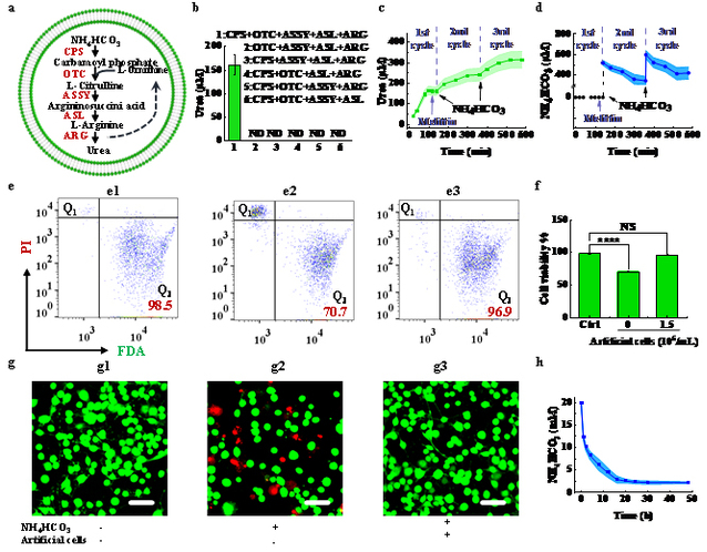 В ответ на этот вызов команда Хань Сяоцзюня успешно реализовала в искусственных клетках цикл мочевины и использовала созданные искусственные клетки для детоксикации аммиака. Данный циклический метаболический путь начинается с NH4HCO3 и синтезирует мочевину с участием всех пяти ферментов: карбамоилфосфатсинтетазы (CPS), орнитинкарбамоилтрансферазы (OTC), аргининосукцинатсинтетазы (ASSY), аргининосукцинатлиазы (ASL) и аргиназы (ARG). Выход мочевины из NH4HCO3 в искусственных клетках достиг 61,9 % за 120 минут.